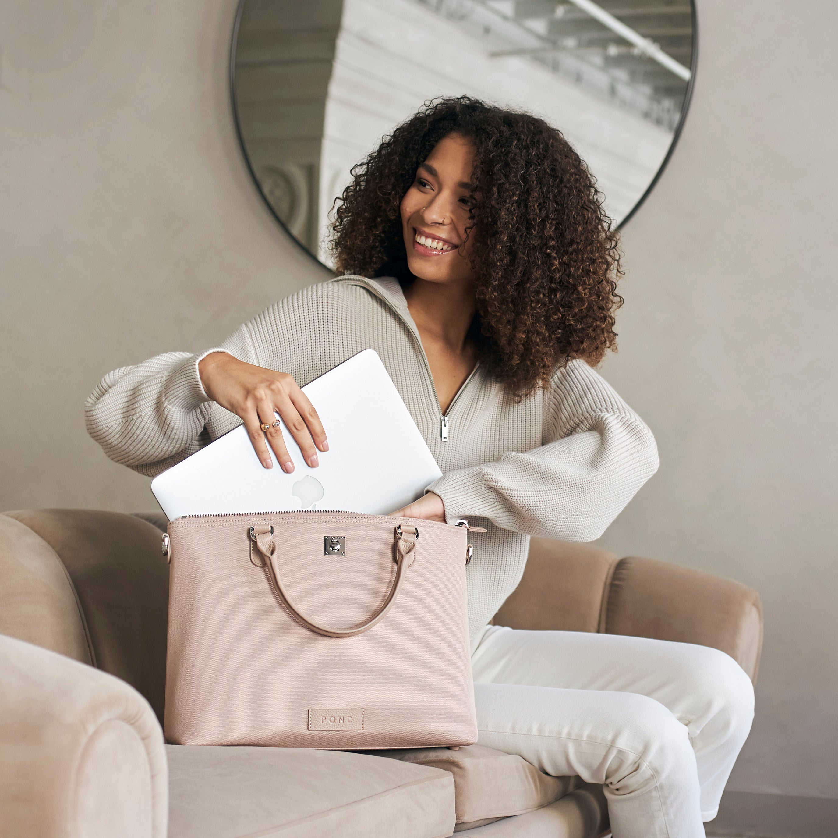 "Crafted with passion, my vision of the perfect daily tote—light as air, soft as a whisper, effortlessly adapting to your lifestyle. The signature laptop compartment ensures you carry your tech essentials in style."