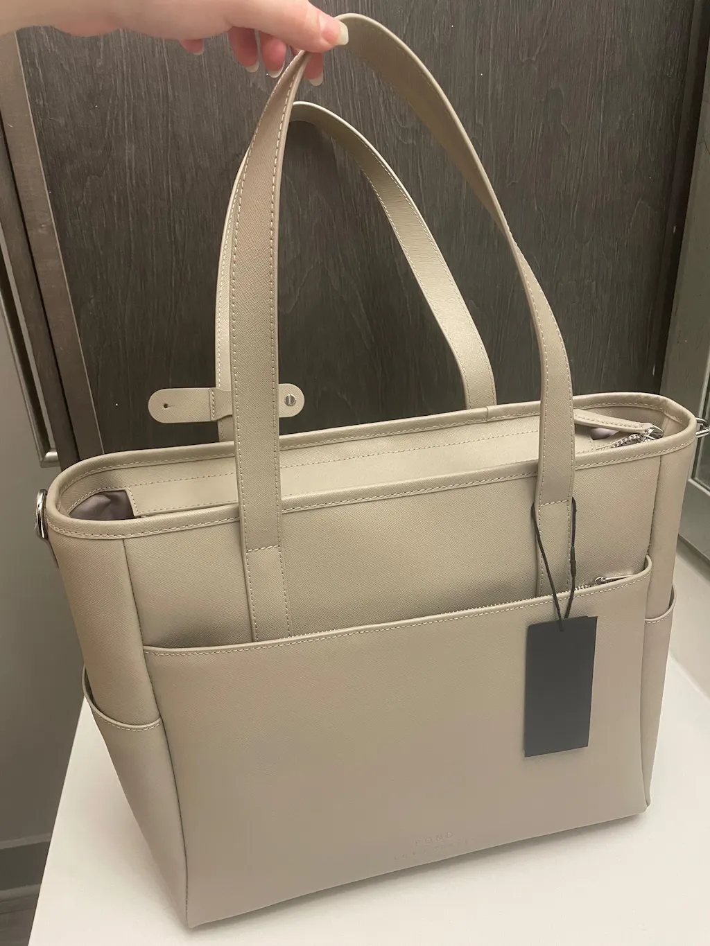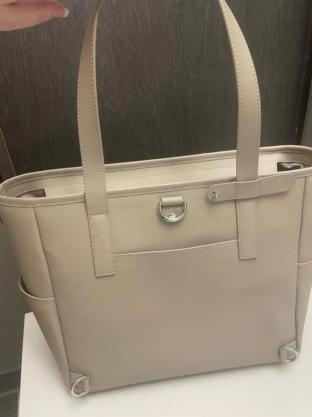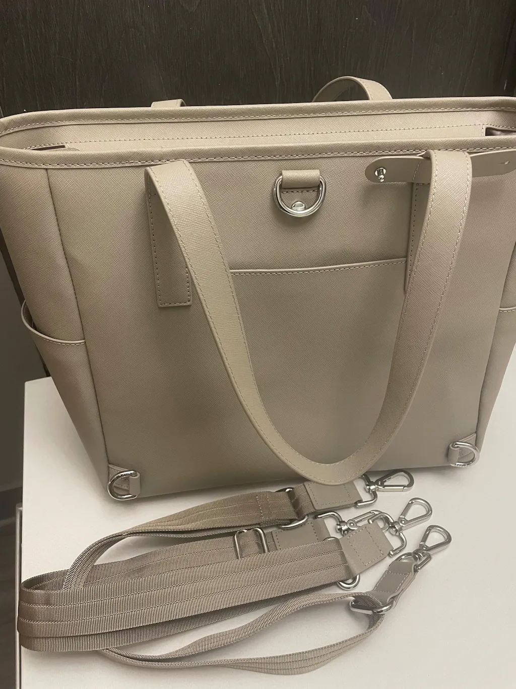 "Whether you want to wear it as a tote, crossbody, or backpack, this bag has enough storage for all your work needs. Its features include a laptop sleeve that fits a 15-inch laptop, side pockets for items as big as drink bottles, and a waterproof and scratch-proof exterior, making for a versatile bag that's built to last."
